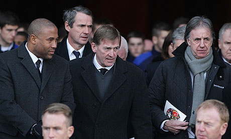 John Barnes, Alan Hansen, Kenny Dalglish and Mark Lawrenson leave Liverpool Cathedral after Gary Ablett's funeral. Photograph: Dave Thompson/PA
